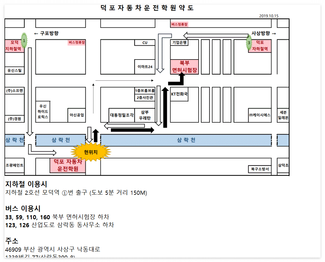 덕포자동차학원은 북부면허시험장 바로 근처에 위치해 있어서 시험을 보러 이동하기도 매우 편리합니다.